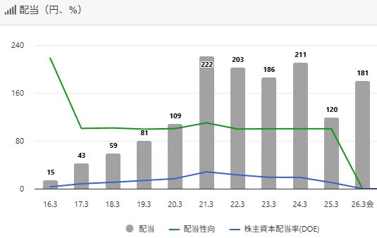 残念ながら減配する年もありますが、長期的には増配していく方針のようですので、今後も安心できるかと思います。(10年で10倍に成長)