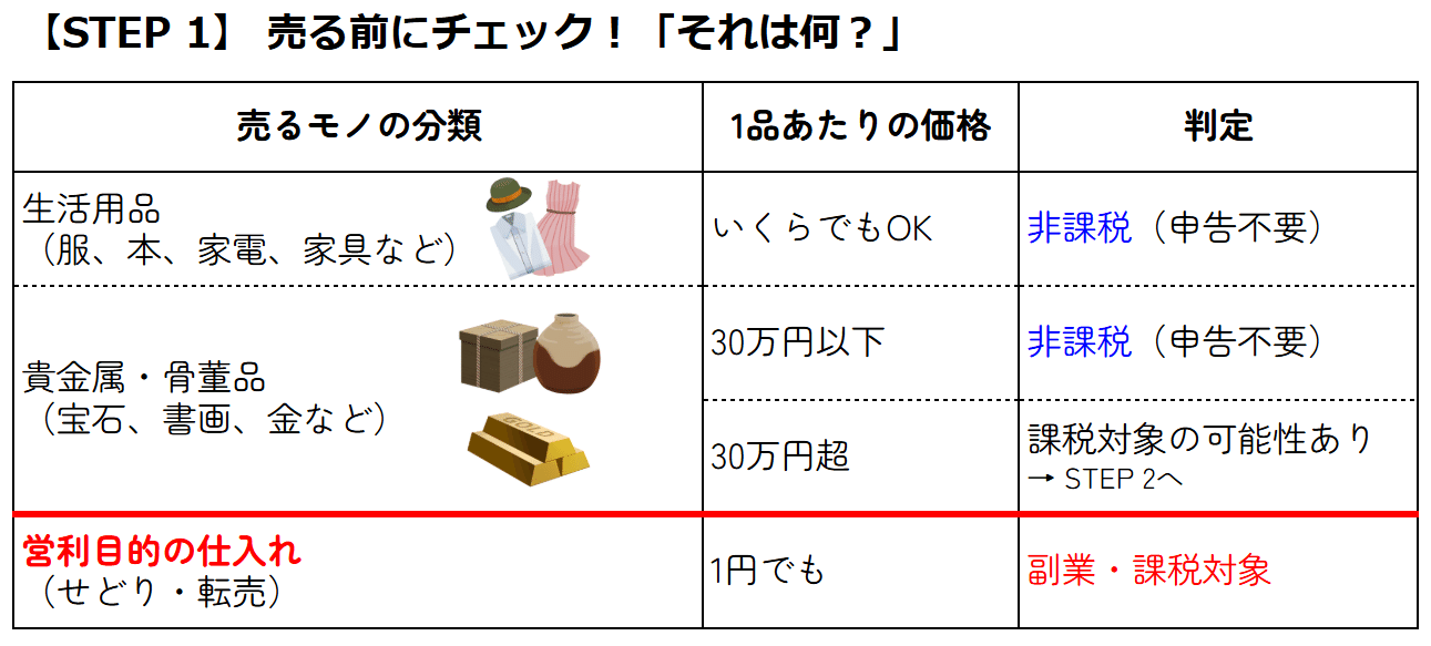 自分の使い古した服や本などの不要品であれば、利益が20万円を超えても「生活用動産の譲渡」として非課税(副業ではない)となります。